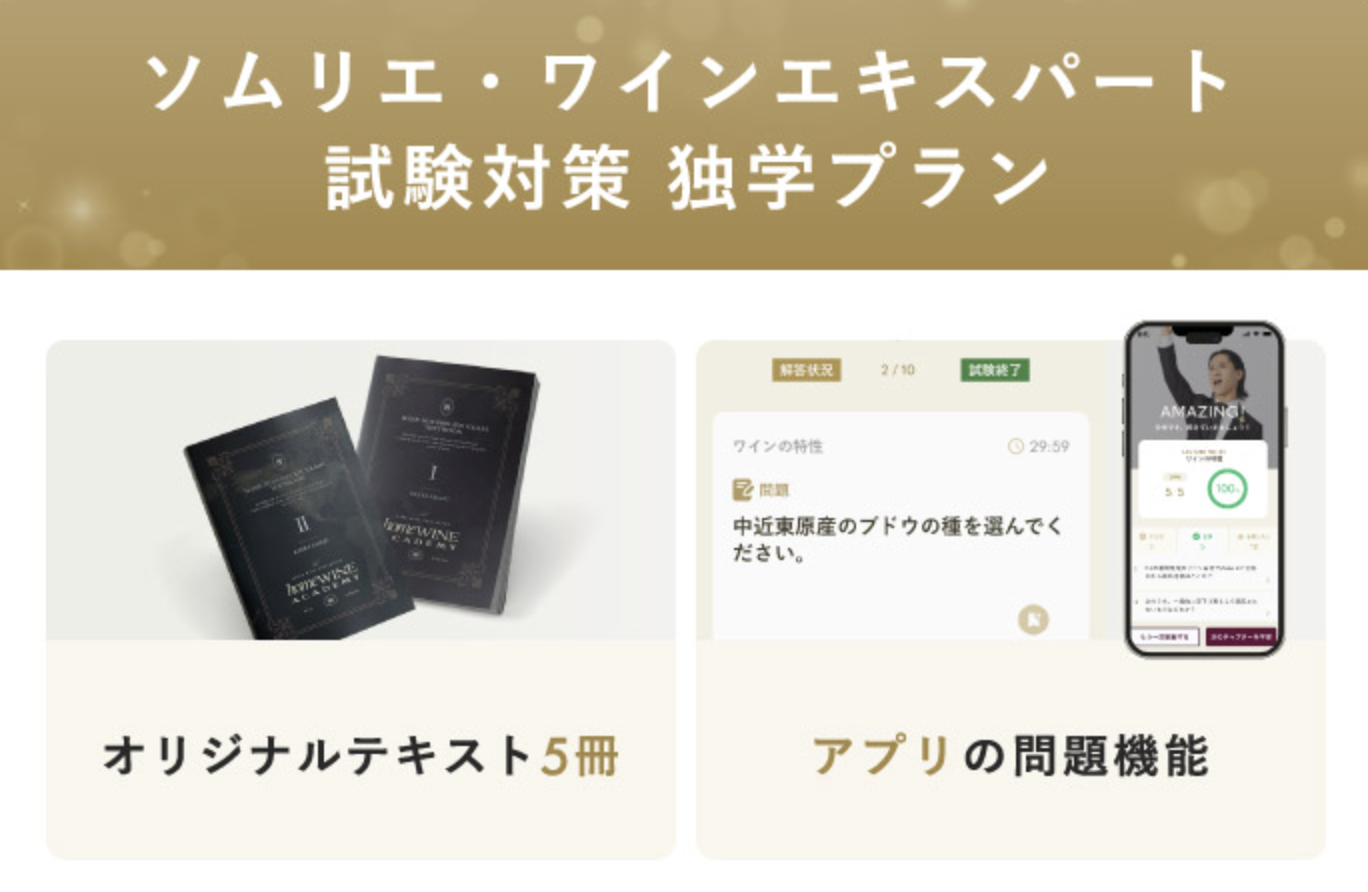 | 提供内容 | ⚫︎一次試験対策講座 ┗解説動画200本程度 ┗オリジナルテキスト5冊 ┗練習問題5000問搭載のアプリ ⚫︎二次試験対策講座(基礎) ┗全54本の小瓶ワイン(テイスティング用) ┗テイスティング講座(全12回) ┗オリジナルテキスト1冊 | ⚫︎一次試験対策講座 ┗オリジナルテキスト5冊 ┗練習問題5000問搭載のアプリ |