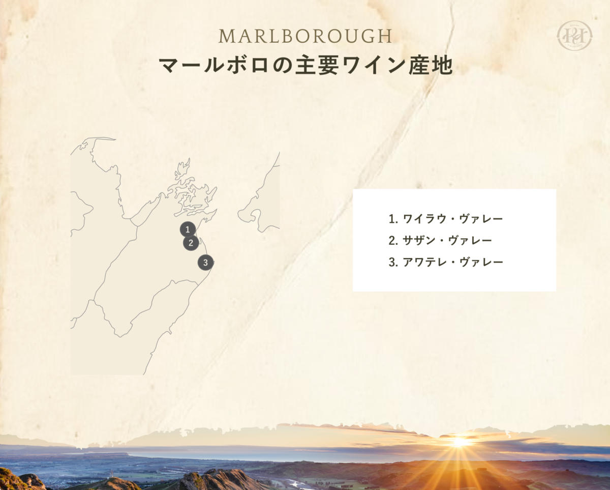 マールボロは、複雑な地形を持つ広大な地域で構成されており、ワイラウ・ヴァレー、サザン・ヴァレー、アワテレ・ヴァレーの3つのサブリージョンに分かれています。